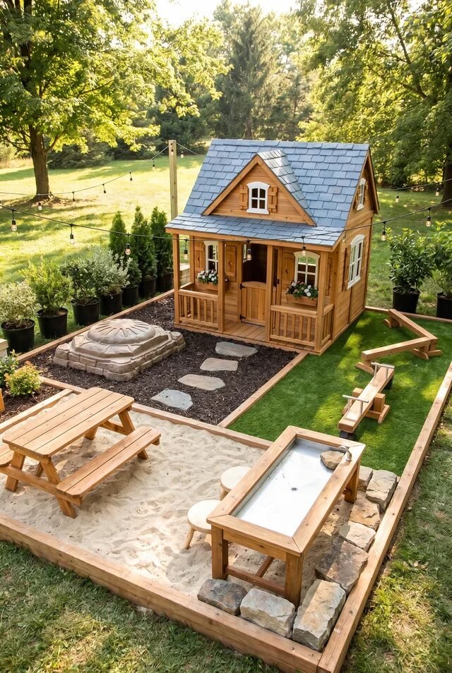 The zoning is subtle but important. You’ve got a “kitchen” area, a seating zone, and even a washing station. When recreating this, think in mini zones instead of one big feature. It helps kids move between activities without losing interest. Zoning also keeps the space organized visually, which parents will appreciate more than they admit.