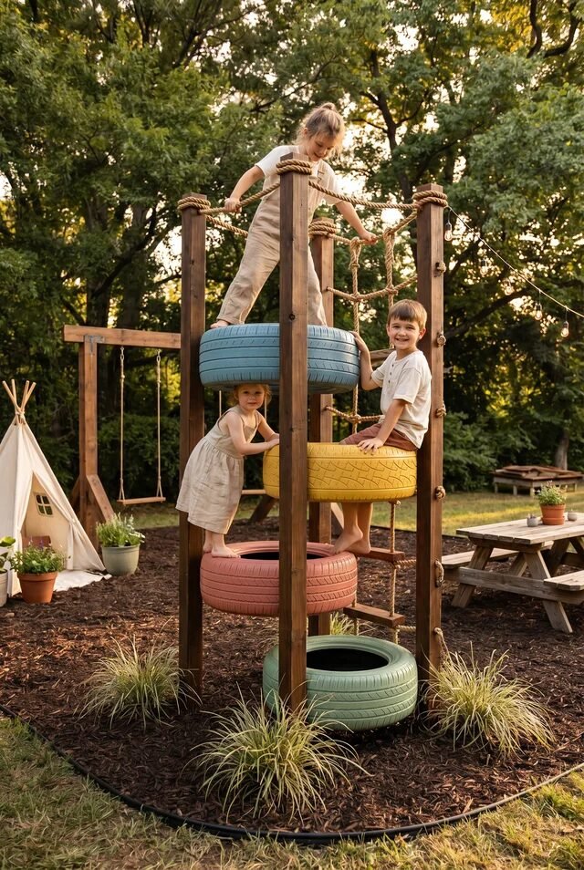 This setup is basically a playground glow-up using what most people would throw away, and we love that energy. The stacked tire tower creates vertical movement, which is huge for keeping kids engaged longer. Anytime we design play spaces, we want height variation—it adds challenge, flow, and keeps boredom out of the chat. The wood posts ground everything visually, while the rope elements soften the structure and make it feel more playful than rigid.