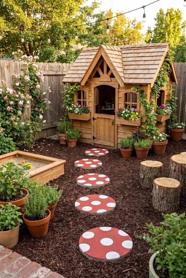 Those mushroom stepping stones? Iconic. They introduce playful contrast against the natural wood and greenery. When recreating this, mix structured elements (like the house) with softer organic ones (plants, vines, flowers). That balance between structure and softness is what keeps it from feeling too staged.