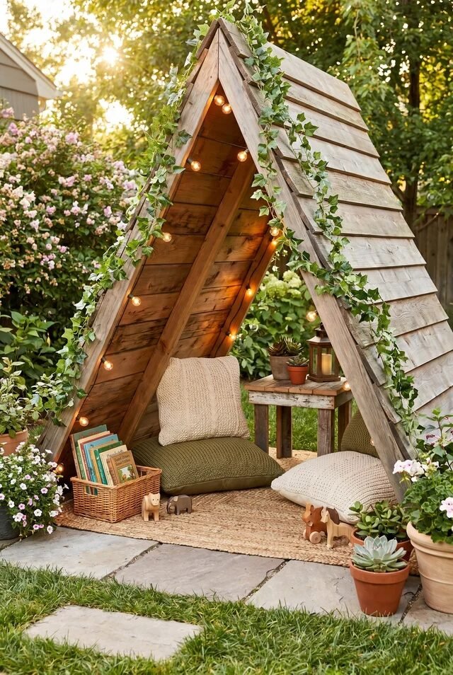If we’re recreating this, don’t overfill it. Leave breathing room so it feels calm, not cluttered. Add books, a basket, maybe a tiny side table, and call it a day. This becomes the “quiet zone” that balances out all the chaos from climbing and running. Yes, we’re designing emotional regulation into the backyard now.