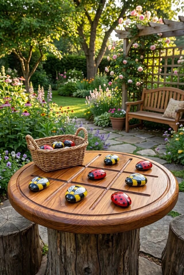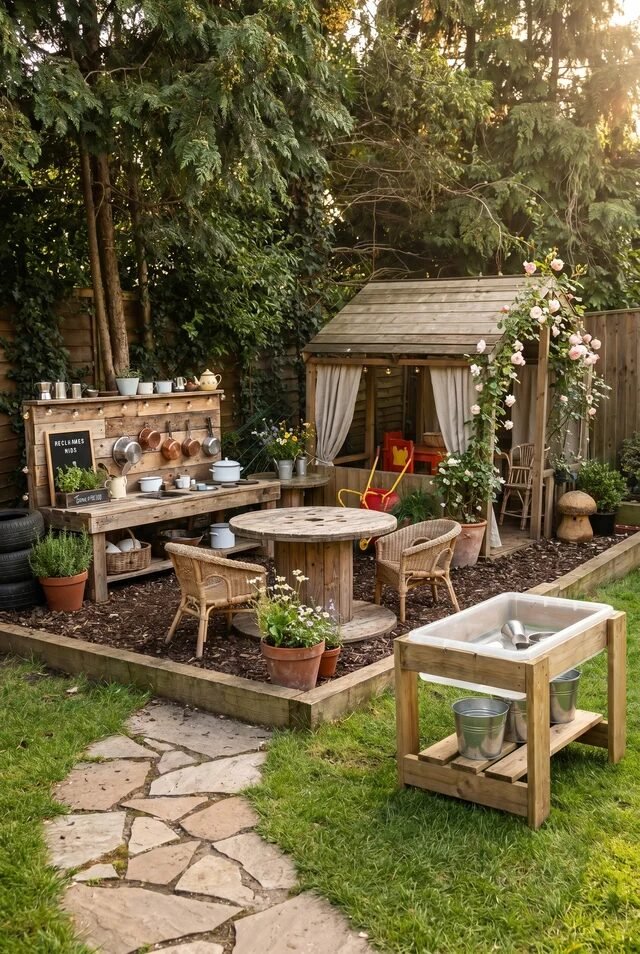 What really elevates this setup is the backdrop. Flowers, pergola, soft greenery—it creates a sense of enclosure without walls. Add a few stools or tree stump seating, and suddenly it feels like a tiny outdoor room. It’s low effort, high impact, and honestly… adults will want to use it too.