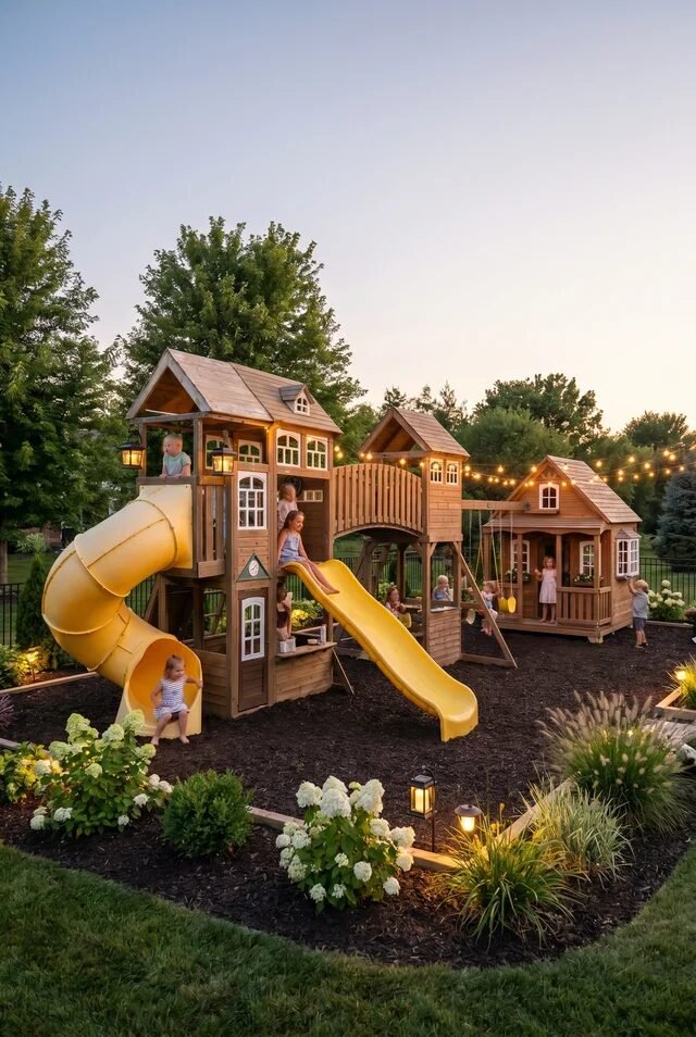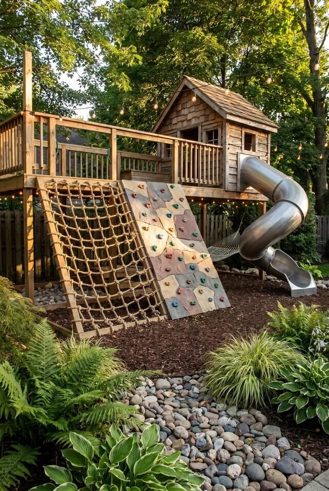 The landscaping underneath isn’t random either. Mulch, stones, and plants soften the structure and make it feel integrated, not dropped into the yard last minute. Add warm string lights and suddenly it’s giving “boutique playground,” not “weekend DIY chaos.”