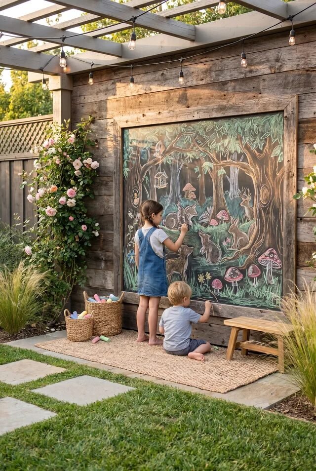 This is what happens when we give kids a blank canvas and say “go off.” The oversized chalkboard instantly becomes a focal point, but more importantly, it creates a creative zone separate from active play. Zoning like this is key—we want high-energy areas and calm, imaginative ones to coexist without competing.