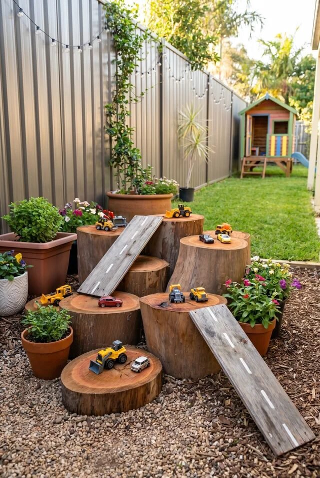 The little ramps connecting each stump are doing all the heavy lifting. They guide movement and create a clear play narrative (aka cars go zoom, obviously). If we’re recreating this, keep the layout slightly irregular. Perfect symmetry can feel boring—organic placement feels more playful and natural.