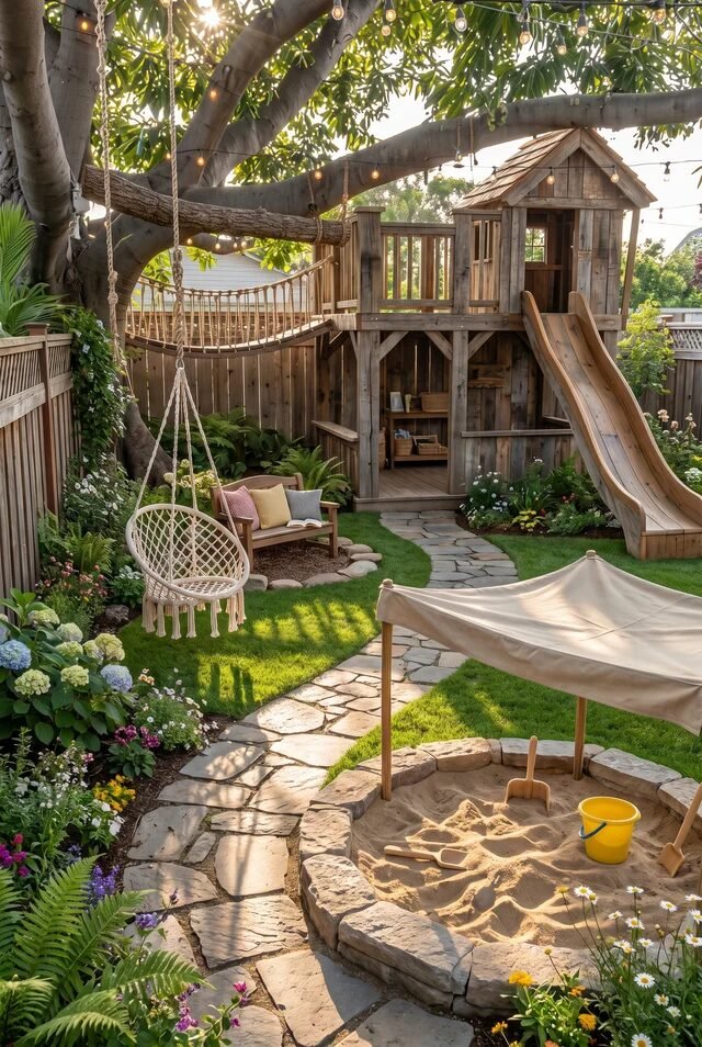 The beauty of these ideas is how adaptable they are. Whether it’s a tiny corner or a full backyard, we can scale the concept by focusing on materials, layering, and smart placement. Natural textures, soft landscaping, and warm lighting instantly elevate even the simplest play zones. Consistency in color and materials is what makes everything feel intentional, not thrown together.
