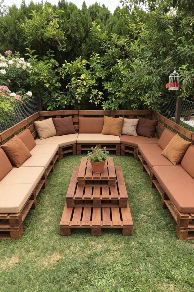Expensive patio sectionals are cute until the price tag appears. Pallets solve that drama fast. By arranging pallet benches into a loose U shape, we create a cozy outdoor “room” that feels planned rather than scattered lawn furniture. The real design trick is enclosure. When seating frames a central table, the layout automatically invites conversation.