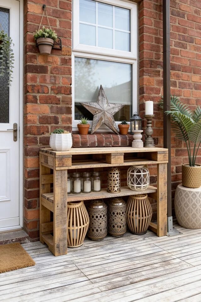 Entry porches love furniture that feels grounded but not bulky. A pallet console table nails that balance perfectly. The open slats keep the piece visually light while the chunky wood adds rustic weight. This contrast between openness and solidity creates visual balance. Translation: it looks styled without trying too hard at all honestly outside today.