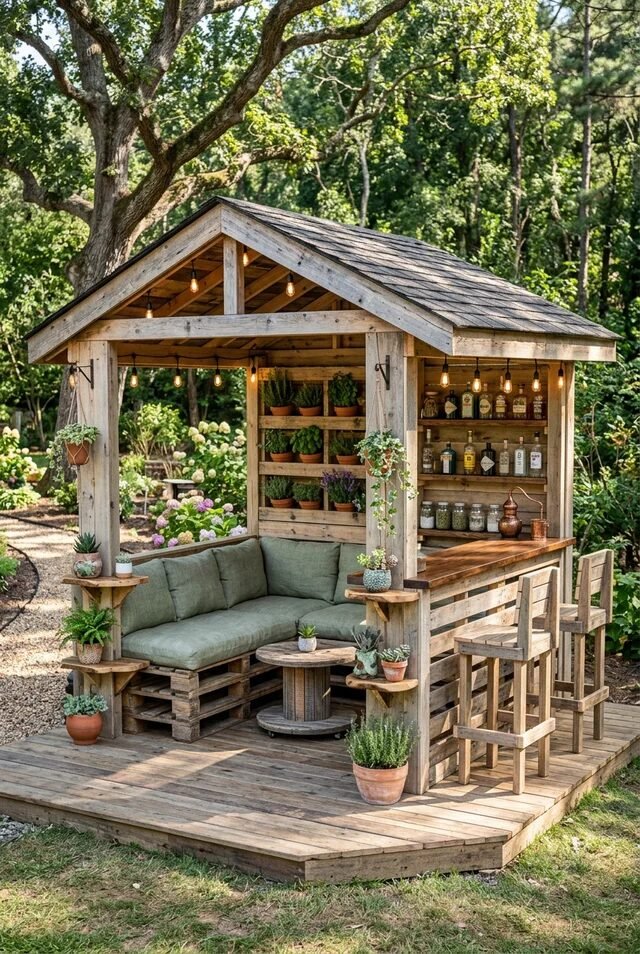 Keep the footprint small if you recreate this. Compact structures feel charming, not overwhelming. Scale is everything in backyard design. Match the bar height with stools around thirty inches, add weatherproof cushions, and suddenly your garden has the energy of a tiny neighborhood cafe ready for relaxed weekend hosting sessions with friends nearby tonight maybe.