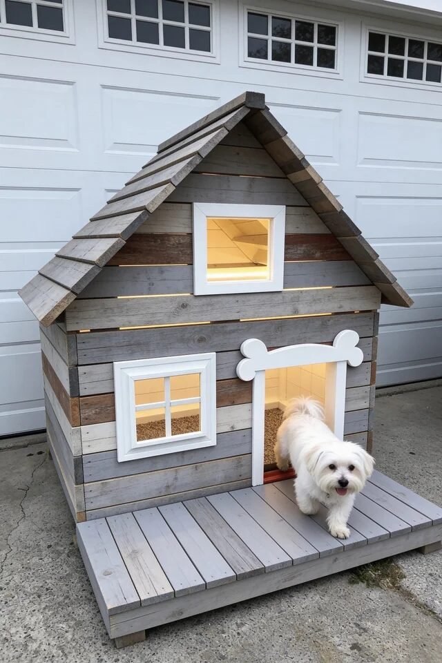 When building one, elevate the base slightly using pallet runners. This protects the wood and improves airflow underneath. Good outdoor design always considers durability. Add a tiny porch platform for muddy paws and your dog basically gets the cutest micro cabin on the block plus a cozy shaded retreat during sunny afternoons outside every single.