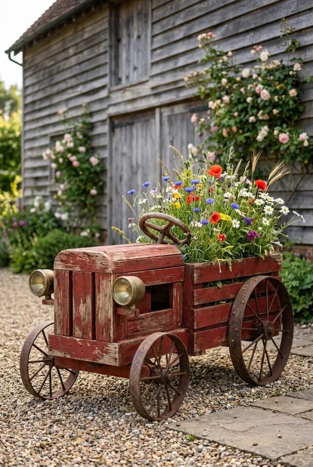 When recreating this piece, fill the planter bed with wildflowers instead of neat rows. Loose, colorful blooms create a playful contrast against the structured tractor shape. Contrast between structure and organic growth keeps garden decor visually interesting. Place it near gravel paths or farmhouse walls so the palette of wood, stone, and flowers feels cohesive.