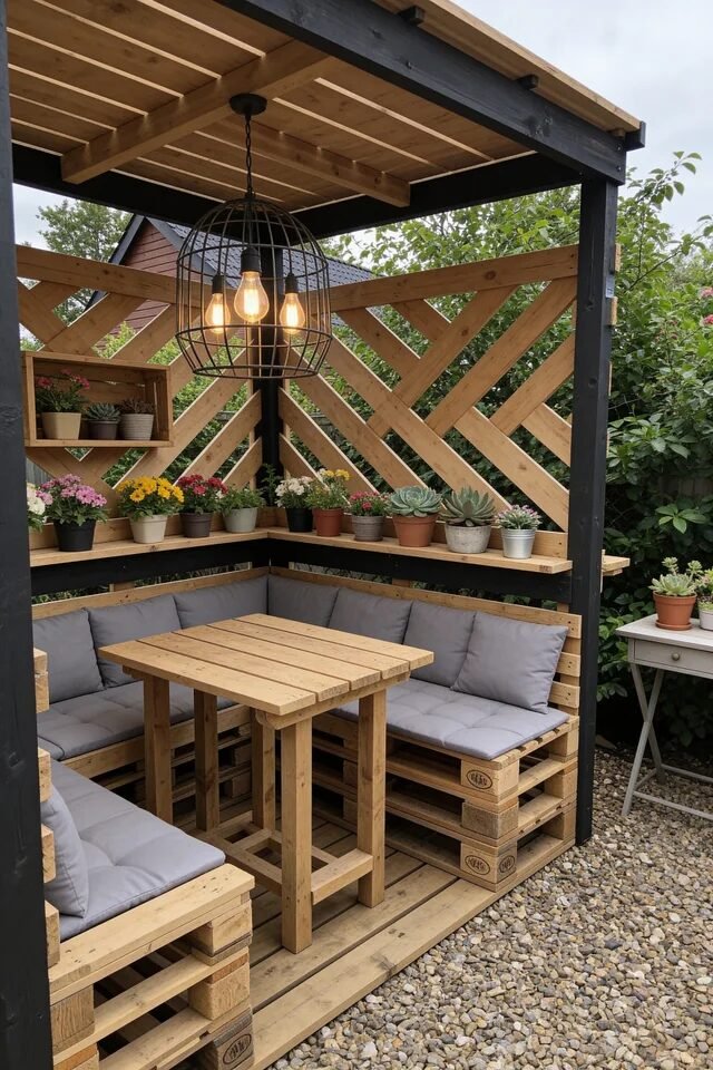 Backyards often struggle with one specific problem: undefined space. A pallet pergola solves that instantly. By framing the seating area with beams and lattice panels, we visually “assign” the space as a dining zone. Architectural framing is one of the easiest ways to organize outdoor layouts.