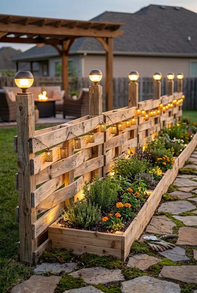 Lighting is the secret finishing touch here. String lights draped across the fence add warmth while highlighting the wood grain at night. Outdoor lighting should enhance texture, not overpower it. Combined with herbs or colorful flowers in the planter bed, the fence becomes both a border and a living garden feature.
