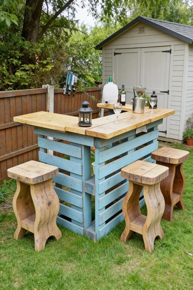 Color plays a quiet but important role here. The soft blue pallet frame contrasts with the warm wood countertop, creating visual separation between structure and surface. Two-tone palettes prevent DIY builds from looking flat. The lighter tone also keeps the bar feeling fresh and casual instead of heavy.
