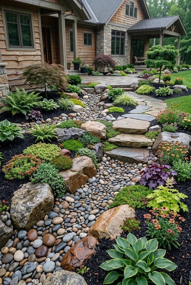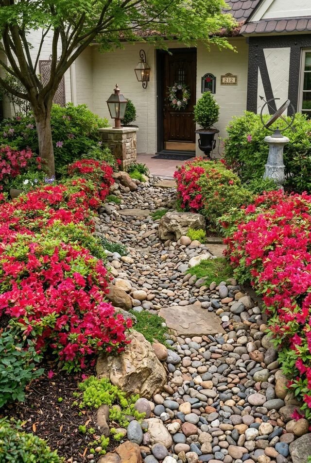 This is straight-up storybook energy, and we’re not mad about it. The river rock path feels organic and slightly imperfect, which is exactly the point. Perfection would actually ruin the vibe here—this design thrives on controlled irregularity.