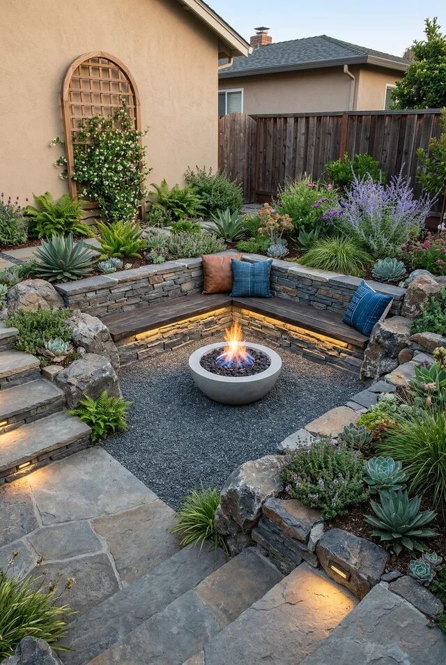 Notice how the gravel and river rock combo defines the “zone” without needing walls. That’s spatial zoning done right. If you’re recreating this, keep your rock size consistent in each area—larger stones for borders, finer gravel for flooring—to avoid visual clutter. And yes, built-in lighting under the bench? Non-negotiable if we want that Pinterest glow-up at night.