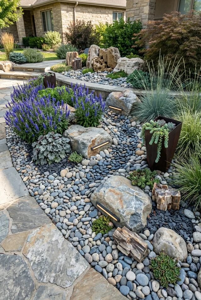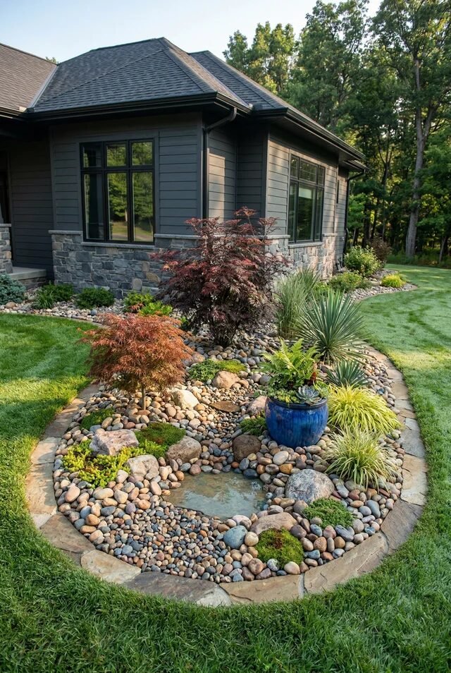 Color coordination matters more than we think. Stick to a tight palette—greens, silvers, maybe a deep burgundy—and let the rocks tie everything together. Too many colors = visual noise, and we don’t do that here. Bonus: river rock is low-maintenance and doesn’t fade like mulch, so it’s a long-term win.