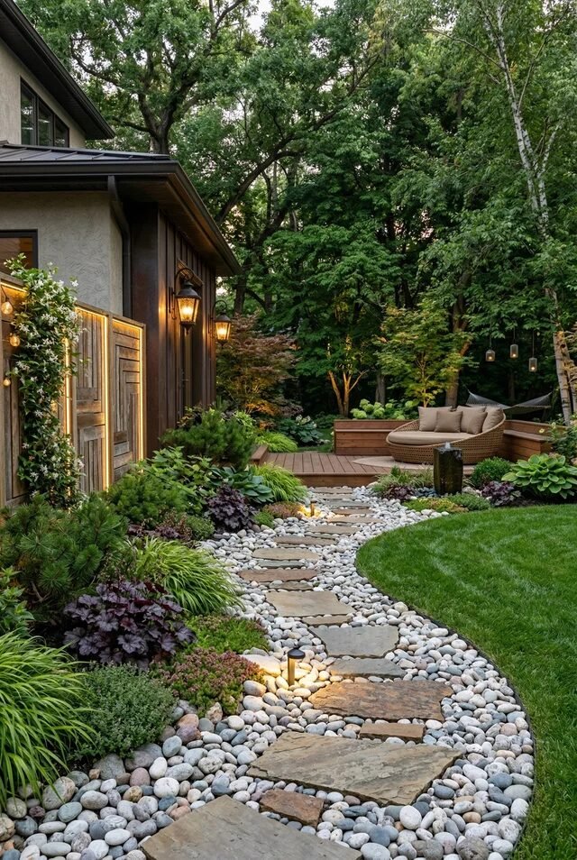 The mix of stepping stones and river rocks is doing double duty—function and texture. The flat stones guide your steps, while the surrounding pebbles create that soft, natural flow. When recreating, keep spacing consistent between stepping stones so it feels intuitive, not like a mini obstacle course.