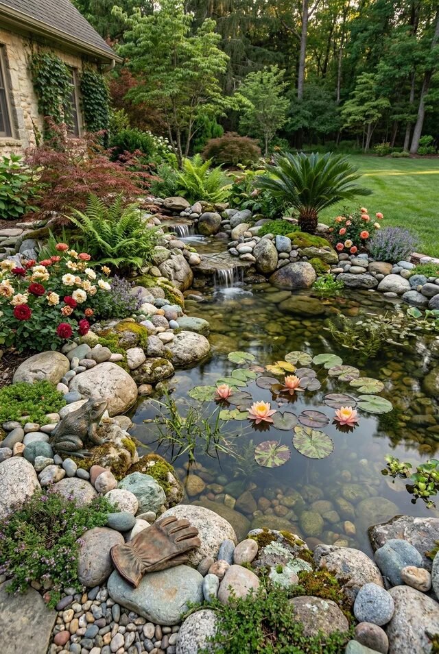 Start with larger boulders to define the pond’s edge, then transition into smaller river rocks as you move outward. This creates a gradient that feels organic and prevents harsh visual lines. Water lilies and aquatic plants soften the surface, while surrounding greenery blends the pond into the landscape.