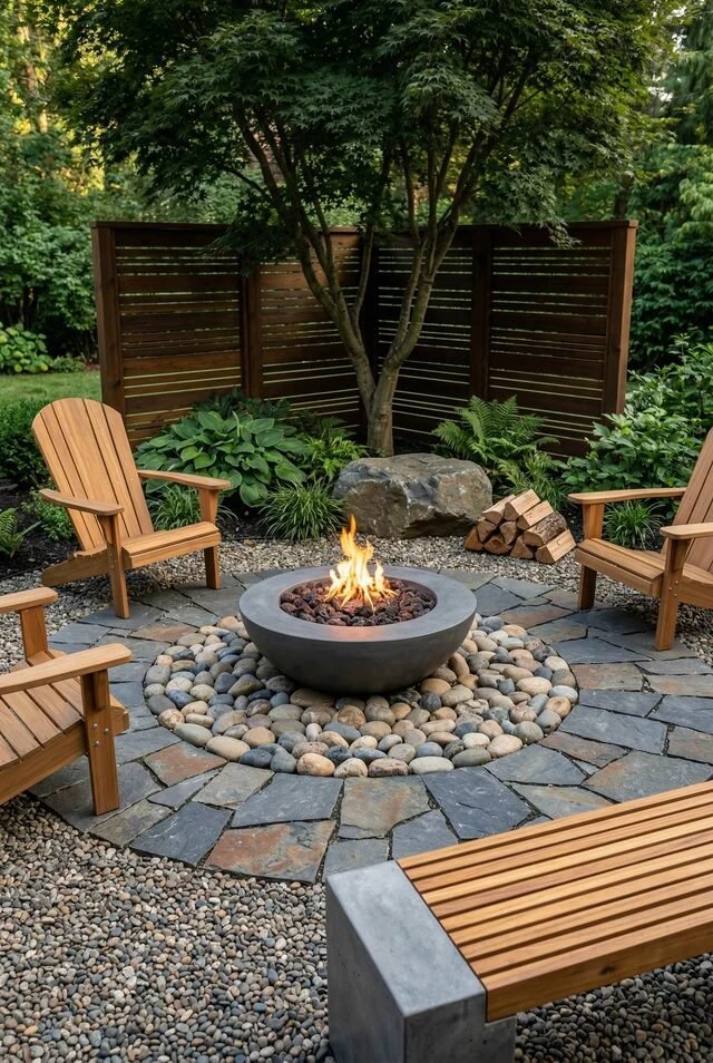 The layering here is low-key genius. You’ve got the central fire bowl, then river rocks, then stone pavers, then gravel. That’s textbook radial zoning, and it keeps the eye moving outward without feeling chaotic. If we’re recreating this, keep your circle crisp—use edging or a template so it doesn’t turn into a wobbly oval situation.