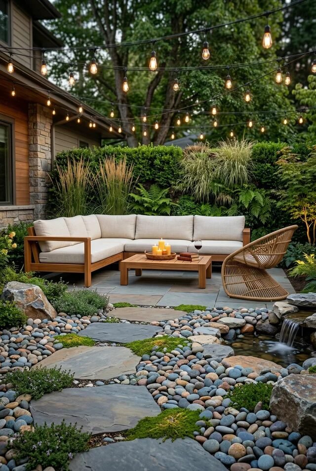 Let’s talk lighting because… wow. String lights overhead create a ceiling effect, making the space feel intimate. Layered lighting (overhead + ground + candles) turns a basic patio into a vibe. Add moss or creeping ground cover between rocks for that soft, “this has been here forever” look.