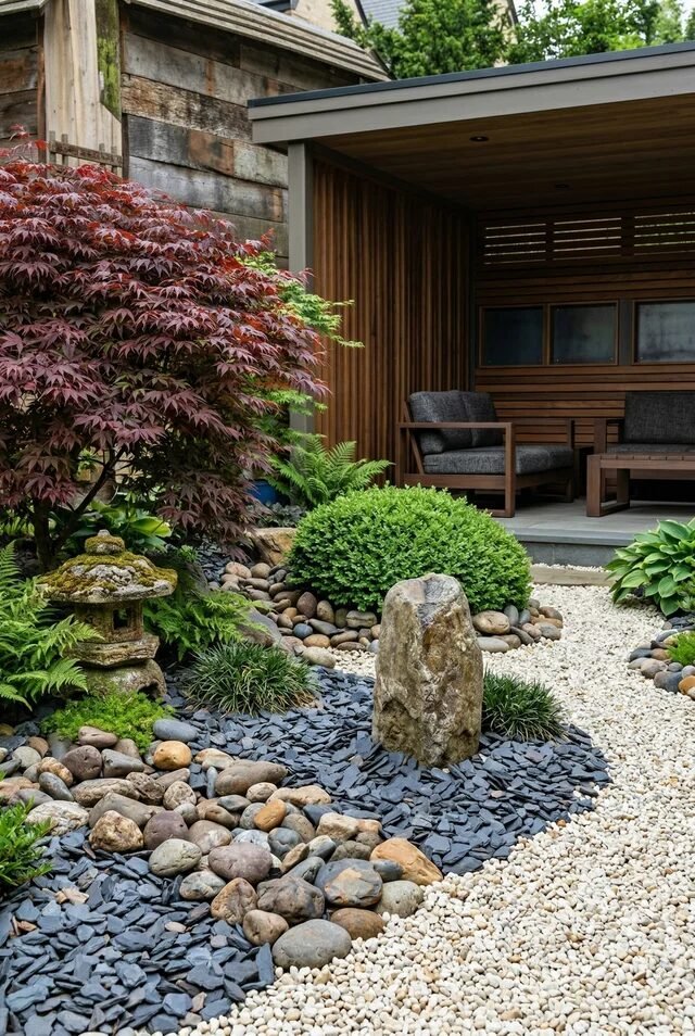 The sculptural stone and Japanese maple are your focal points, so everything else supports them. Restraint is the real flex here—less clutter, more intention. Keep plant choices minimal and textural, not colorful. This is not the place for chaos, this is the place for “we have our life together” energy.