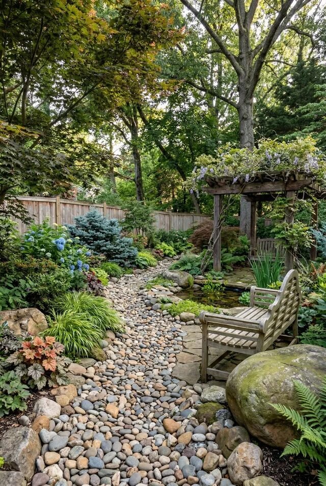 The pergola and seating nook at the end act as a destination, which is key. Good landscape design always gives the eye somewhere to land. Use shade-loving plants, varied leaf shapes, and muted tones to keep that woodland feel consistent. And yes, bigger stones placed strategically = instant “nature did this” illusion.