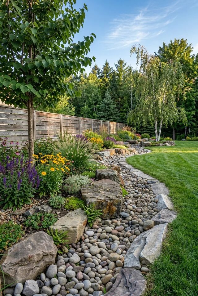 If your yard has that awkward empty strip along the fence… this is your moment. Turning it into a dry river bed instantly gives it purpose. We’re transforming “dead space” into a visual pathway that guides the entire landscape.