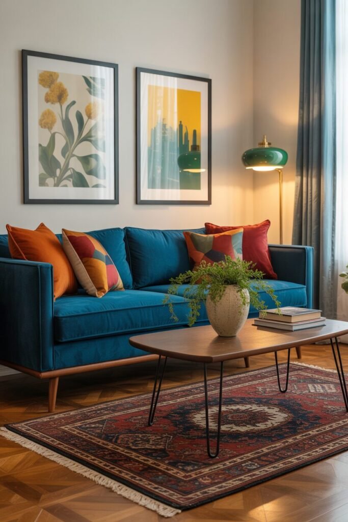Let’s talk about statement sofas that speak louder than your ex’s playlist. This bold teal-blue couch brings instant drama — but in the best, most sophisticated way. The key design principle here is color temperature balance. Blue tones feel cool and calm, but when you pair them with warm hues like burnt orange or mustard, you instantly create harmony.