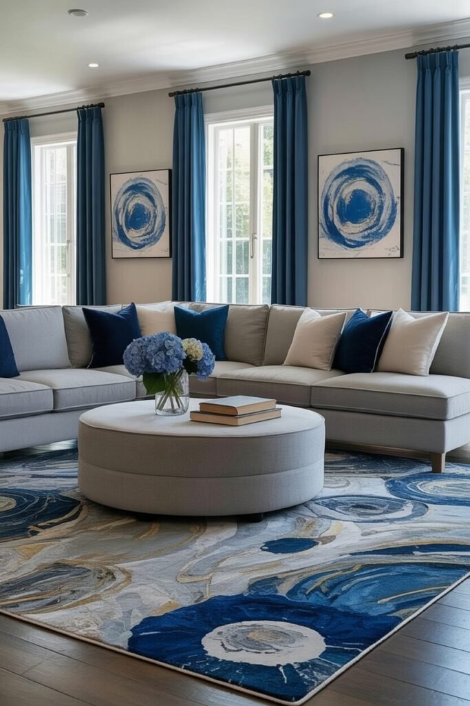 The trick? Pair blue with earth tones — soft greens, warm woods, and creamy whites — to prevent it from feeling sterile. Design-wise, this is an example of contrast and proportion done right. The dark wood table anchors the palette, and the patterned rug adds rhythm.