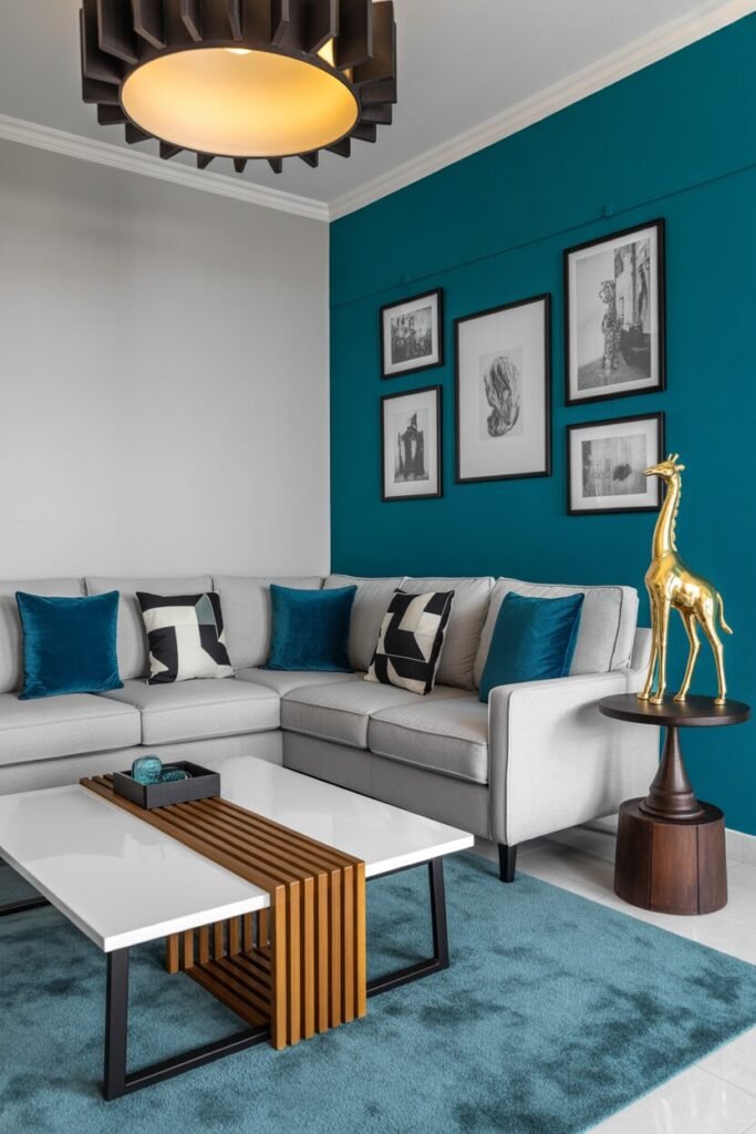 Now we’re getting bold and boujee. This room proves that a deep teal wall can make even the simplest furniture look designer-level. The secret sauce? Color depth and contrast control. That saturated teal adds drama, while the grey sectional calms it down.