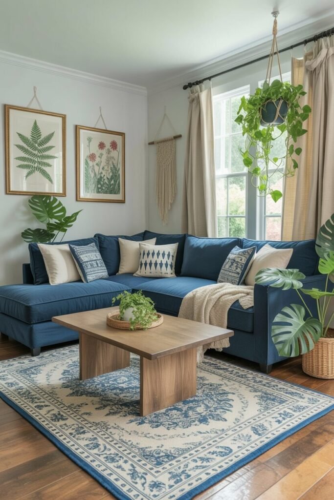Okay, this one’s basically “your Pinterest board just came alive.” The deep navy couch anchors the space while the plants and woven details make it breathe. This is where biophilic design meets cozy modern living. Blue symbolizes calm and trust, and when paired with greenery, it creates an atmosphere that’s both grounding and rejuvenating.