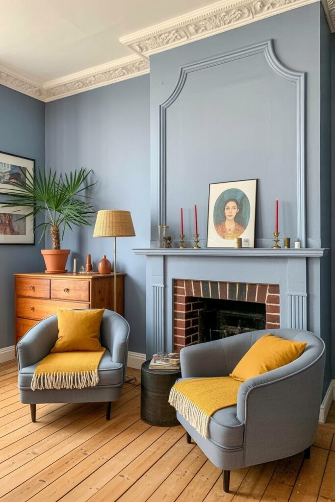 Vintage vibes? Check. Bold color combo? Double check. This moody blue-and-yellow setup gives instant charisma. The muted blue walls and armchairs set a nostalgic tone, while mustard-yellow accents inject vibrancy. This is a masterclass in complementary color balance.