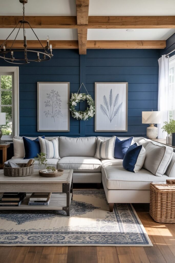 This one’s the perfect marriage of coastal calm and cabin coziness. That navy shiplap wall instantly gives the room depth — it’s a visual anchor that makes lighter furniture pop. The creamy sectional keeps the palette balanced, while those striped navy pillows tie everything together with effortless rhythm.