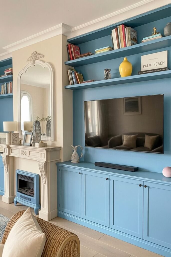 Okay, who said storage can’t have main-character energy? This built-in setup shows that color blocking and symmetry can completely transform your living space. That dusty blue cabinetry feels fresh but sophisticated, especially paired with the cream-toned fireplace.