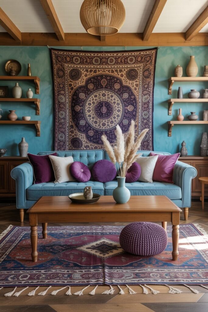 If you’re craving something bold, this one’s pure serotonin. The turquoise wall, paired with deep plum accents, creates a color romance moment. It’s not just boho — it’s boho grown up and sipping chai in style. The design principle at play here is complementary contrast — warm purples against cool blues amplify each other’s richness.