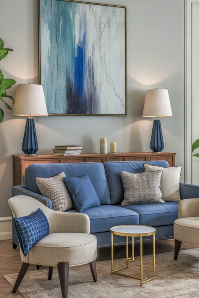 If peace had a color palette, this would be it. The soft blue sofa, abstract wall art, and elegant symmetry of those lamps create a vibe that says: “I’ve got my life together (even if I ordered takeout again).” What makes this setup so visually satisfying is repetition and rhythm — the lamps, the pillows, the artwork — all echo shades of blue in different textures and tones.