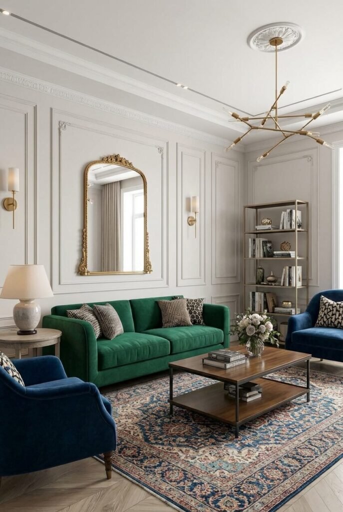 We’re mixing saturated colors with soft neutral walls and ornate panel molding so the room feels rich, not chaotic. Notice how the gold accents in the mirror and lighting subtly repeat across the space. That repetition creates visual rhythm, which is a quiet luxury trick designers swear by. The patterned rug grounds everything, acting as a bridge between bold furniture and calm architecture.