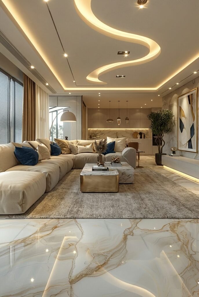 If you’re recreating this, focus on ceiling design early. It’s often ignored, yet it defines the entire atmosphere. Luxury isn’t about filling space, it’s about shaping it. We love how the marble floor reflects light, subtly amplifying brightness without screaming for attention.
