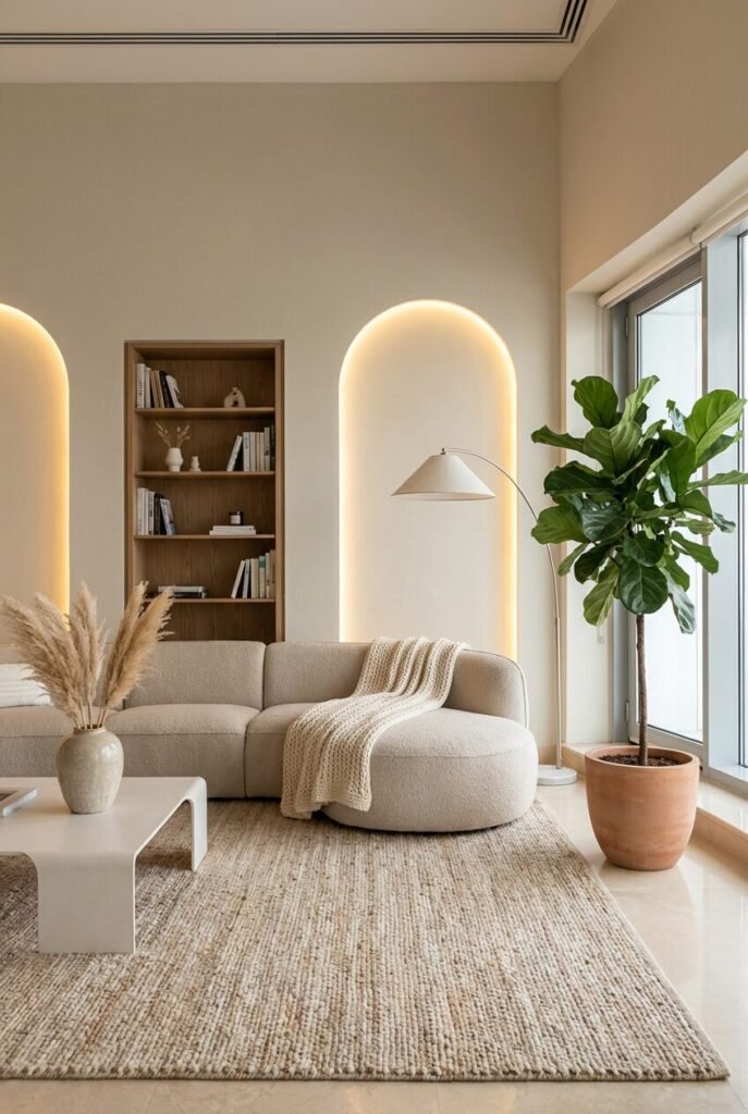 This space whispers luxury instead of shouting it, and that’s exactly the appeal. The curved sofa immediately softens the room, creating flow and approachability. In minimalist luxury, form replaces ornament. The arched wall niches with integrated lighting add depth without clutter, functioning as architectural decor.