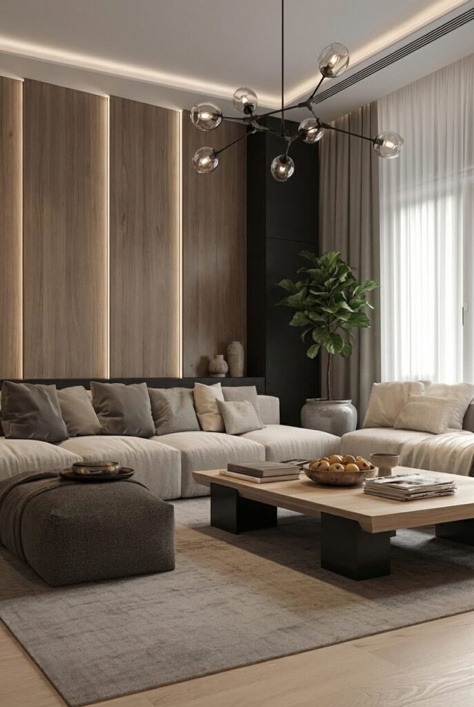 This living room leans into warmth, and that’s exactly why it feels expensive. The wood-paneled TV wall introduces natural texture, which offsets the sleek lines of modern furniture. Luxury interiors thrive on material contrast rather than color overload.
