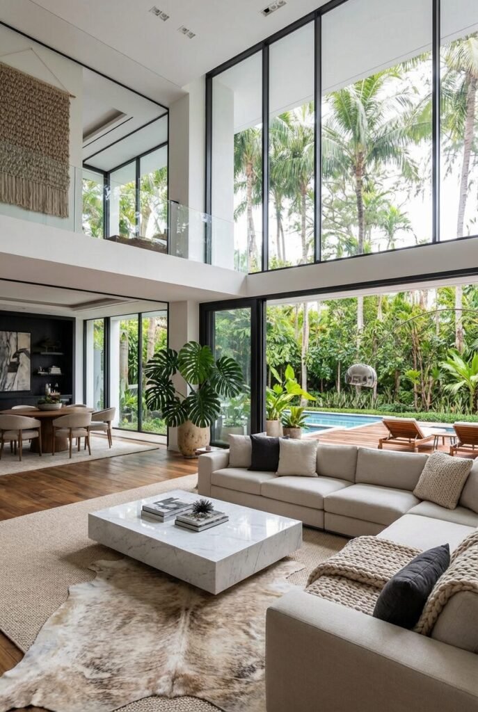 This living room feels like a permanent vacation, and the design knows exactly why. Floor-to-ceiling glass blurs the line between indoors and outdoors, expanding the perceived space instantly. Luxury living thrives on connection to nature. The neutral sofa anchors the room while allowing the lush greenery outside to steal the show.