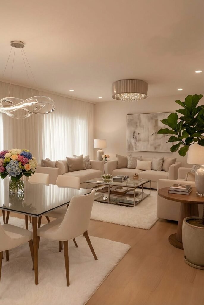 This living room proves neutrals don’t have to be boring. Soft beige tones dominate, but reflective surfaces and layered lighting add dimension. Luxury neutrals rely on variation, not sameness. The glass dining table nearby keeps the open-plan space feeling light, while plush seating adds comfort.