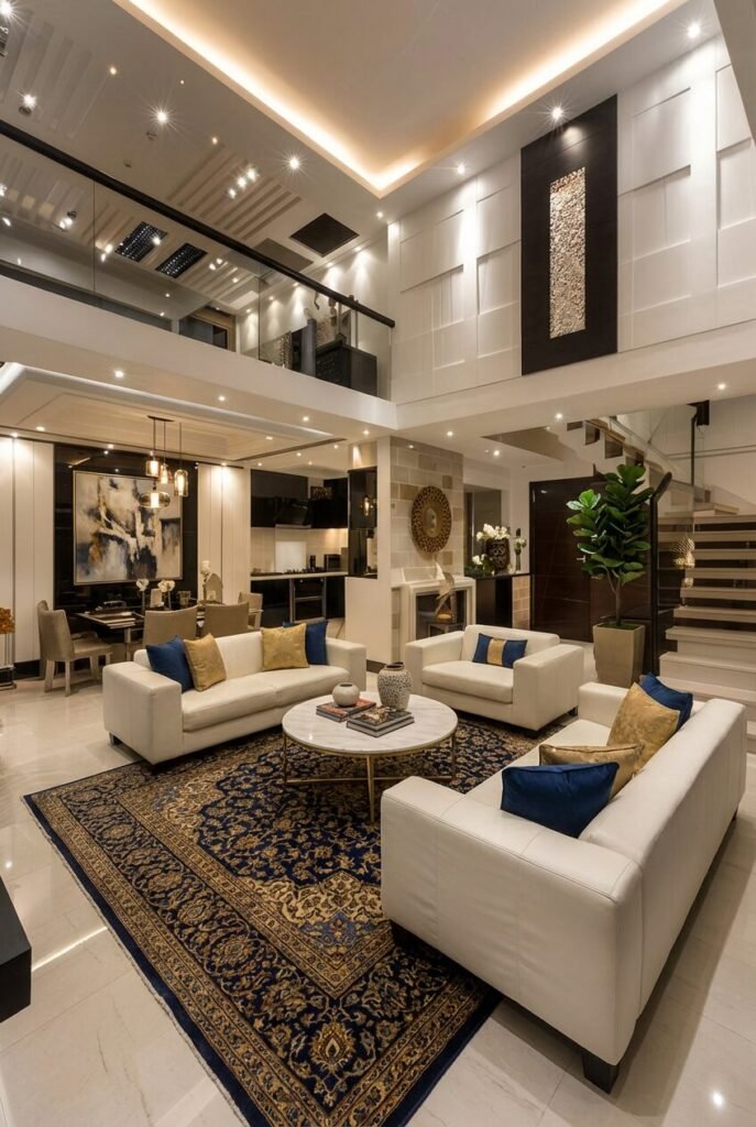 We love how layered lighting pulls the eye upward without feeling theatrical. The mezzanine railing adds architectural interest and frames the space instead of cutting it off. Neutral tones dominate, but blue and gold accents prevent monotony. If you’re recreating this at home, focus on zoning. Rugs, ceiling treatments, and lighting clusters help massive rooms feel human-sized. Luxury spaces should impress first, then comfort immediately after.