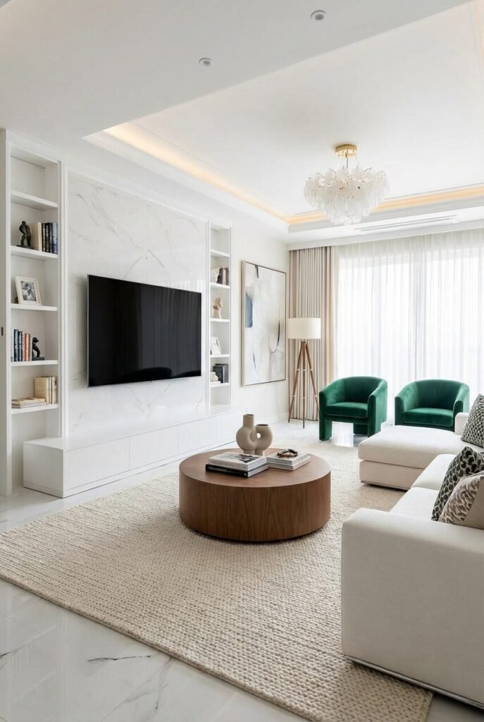 This living room nails the balance between crisp and inviting. White walls and marble finishes set a clean foundation, while green accent chairs inject personality. Luxury design often starts neutral, then adds controlled contrast. Built-in shelving frames the TV and provides visual structure, making the wall feel intentional rather than empty.