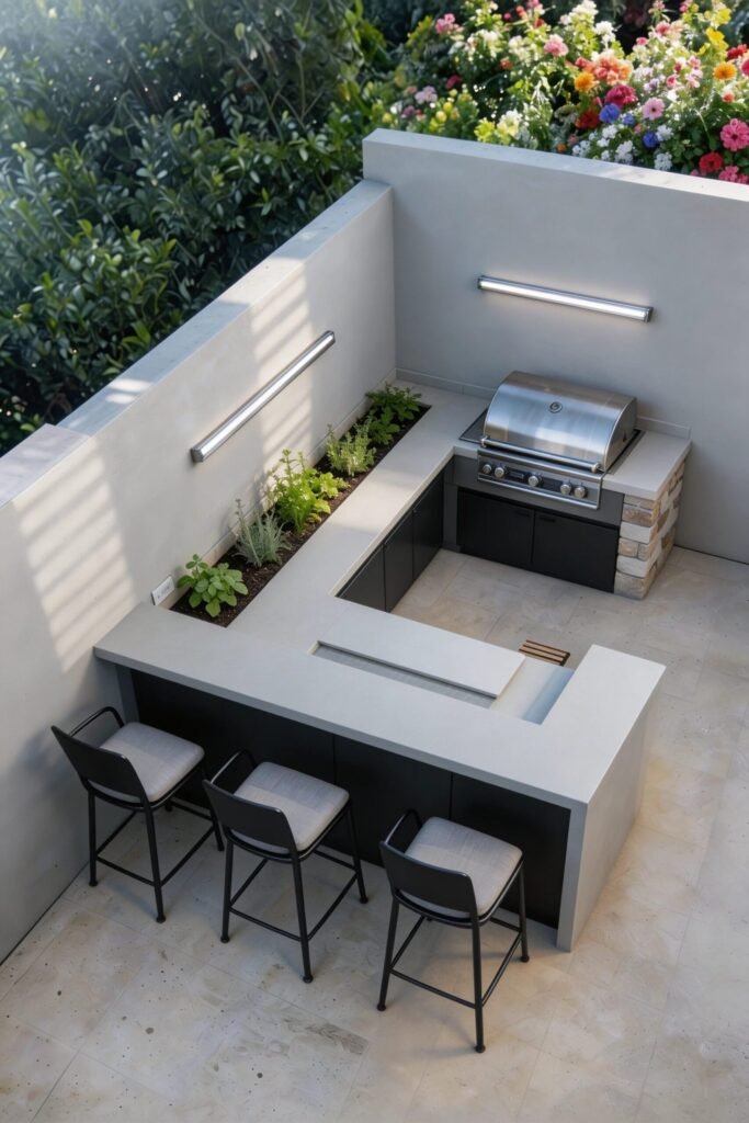 Notice the clean minimalist palette: pale counters, matte black cabinetry, and stainless appliances. This works because outdoor kitchens benefit from high contrast materials that resist visual clutter and weather wear. The built-in herb planter is also doing double duty here. It adds greenery while placing fresh ingredients within arm’s reach—practical design disguised as decor.