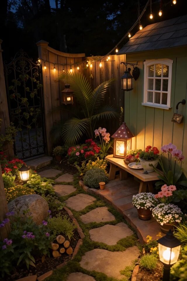 Some backyard corners are perfect for practical things like grills or seating, and others deserve to feel straight out of a fairy tale. This tiny garden nook works because the design focuses on intimacy and layered lighting rather than size. The winding stone path pulls us into the space, which is a classic landscape trick: curved pathways create curiosity and visual movement.