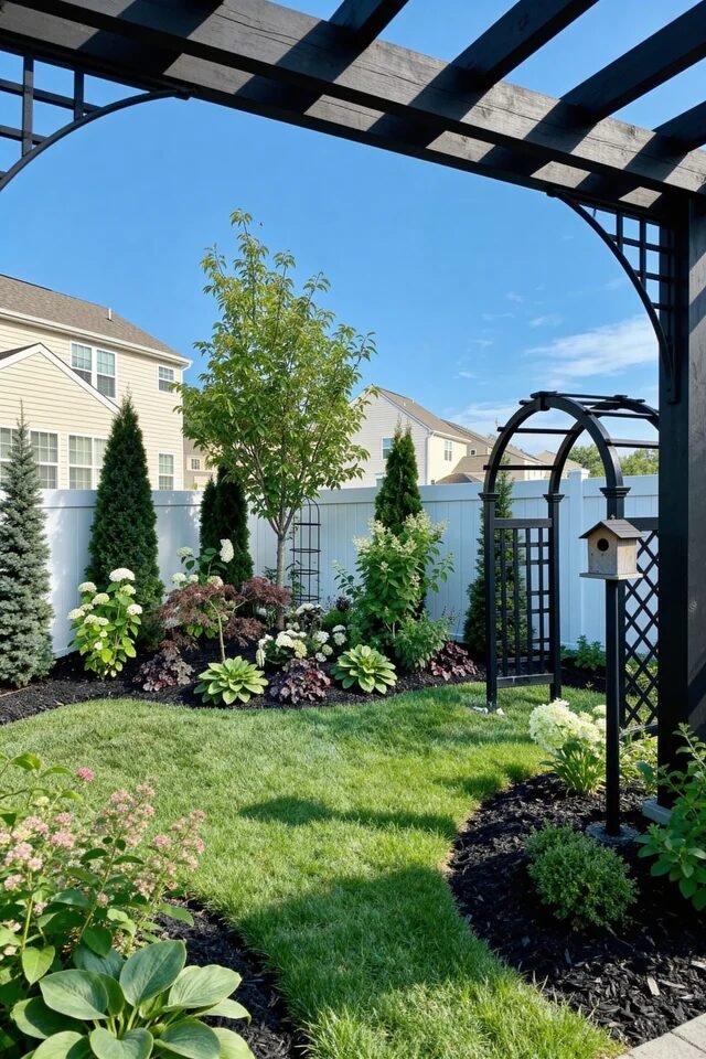 Backyard corners often feel visually empty, which is exactly why adding a structure like an arbor works so well. The arch immediately becomes a vertical focal point that draws the eye upward, balancing the horizontal lines of the fence and lawn. Design-wise, this is a classic trick: introduce height where a space feels flat.