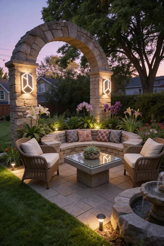 Lighting plays a starring role here too. The modern sconces on the stone arch provide vertical glow while the small landscape lights highlight plants and pathways below. Layered lighting is essential for outdoor spaces because it defines zones after sunset. Add textured cushions and flowering plants around the seating area and suddenly this backyard corner feels like a boutique garden lounge.