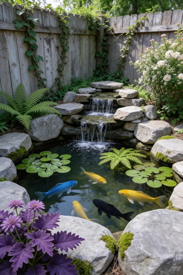 Water features are one of the most powerful ways to transform a backyard corner because they introduce motion, sound, and reflection all at once. This koi pond works beautifully thanks to natural stone layering that mimics a miniature landscape waterfall. Instead of looking artificial, the rocks create a believable ecosystem.