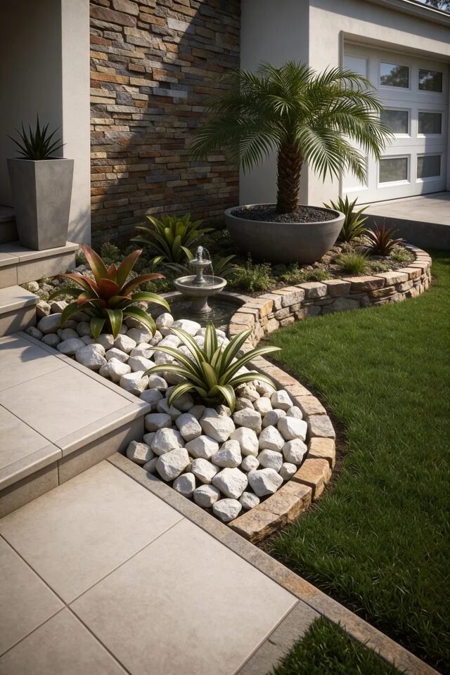 Plant selection also follows the rule of layered heights. Tall palms establish the backdrop, mid-height shrubs fill the middle layer, and spiky agaves or grasses add sculptural accents in front. Good landscape design always builds depth from back to front, like a theater stage for plants. This prevents the corner from looking flat or cluttered.